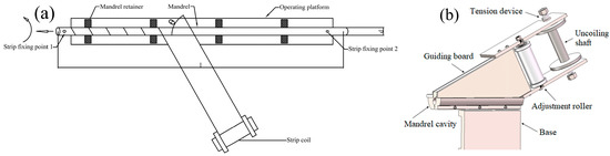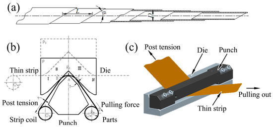 The current most well-known method for forming STACERs is the CSPB (compositing stretch and press bending) method proposed by Li [6,7]; other methods are not as clear in detail, such as that proposed by Wu [8]. In the CSPB process, the forming tools consist of a pair of a punch and die; a thin strip is pulled out of the clearance of the forming tools, and STACERs with various diameters are obtained by adjusting the size of the mold clearance. One of the most notable features of CSPB is that forward bending and reverse bending are introduced to guarantee size accuracy and deploy precision and stability. Key forming parameters such as post-tension, die gap, punch radius, and strip thickness have been well studied, as well as the mechanical properties of the STACER as an aerospace component, as elaborated in the literature [6,9,10]. Yu et al. [11] proposed a method for simulating the STACER’s deployment deformation, in which a variational method was adopted. Based on the deformation characteristics of the steel strip, a proper and possible shape function space was established to calculate the principle stress and deformation energy due to the variation pattern of the extension length of the STACER and, finally, the deploying force was obtained by using the principle of minimum potential energy and the principle of virtual work. Li et al. [12] conducted the analysis and verification of the deployed stiffness of a STACER and found that the natural frequency first mode and specific stiffness changes with different tip radii, tip helix angles, strip widths, and strip thickness of the STACER. Kong et al. [13] analyzed the influence of top rod radius on the gathering process and the effects of surface friction coefficient and acceleration on stability during the gathering process of a STACER.