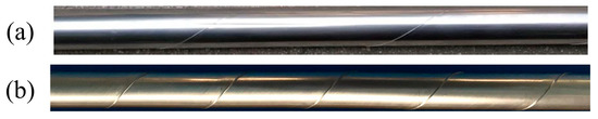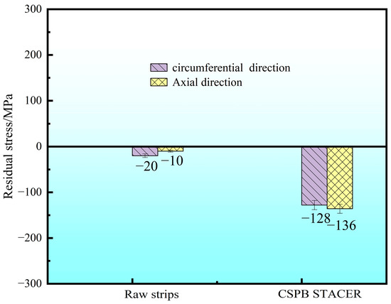 The raw strips and CSPB STACER were tested for residual stress by the sin2 Ψ method; as shown in Figure 9, the residual stress values of the raw strips were −10~−20 MPa, while for the cold-formed STACER, the residual stress components were −128 MPa (τxy) for the circumferential direction and −136 MPa (σx) for the axial direction. After the cold forming process, due to the larger angle of the rolling direction of strips to the axial direction of the STACER (see α angle in Figure 1a.), larger residual compressive stress (mainly τxy) was needed to tighten the adjacent strip layers and to provide enough stiffness to keep the geometric configuration of the STACER to meet its service performance.
