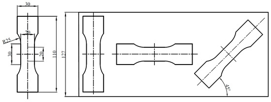 The schematic plot of tensile specimen and cutting directions of strips (Unit: mm).