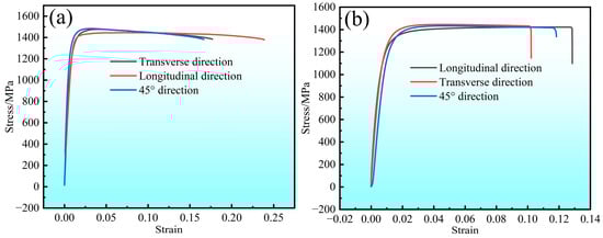The results of the tensile experiment for raw Co40NiCrMo strips are shown in Figure 5a, and the data are laid out in Table 2. The stress–strain curves show similar patterns with the tensile strength/elongation rate at 1478.09 MPa/17.92%, 1445.83 MPa/24.96% and 1483.22 MPa/18.48% (average value is 1469.04 MPa/20.4%). The longitudinal direction shows a slightly lower value in tensile strength and a higher value in elongation rate than the other two directions. The stress–strain curves of the cold-formed CSPB STACER (see Figure 5b) show almost the same trend as the raw strips. The values of all the tensile strength/elongation rates are 1418 MPa/12.8%, 1415 MPa/11.6%, and 1429 MPa/10.1% (average value is 1421 MPa/11.5%), implying that the CSPB process had little influence on the tensile properties of the cold-rolled raw strips [22].