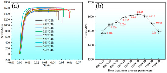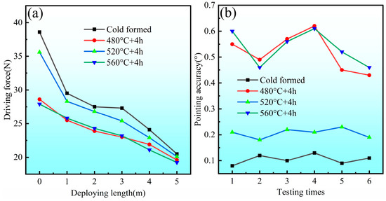 The stress–strain curves of the STACER formed by the winding and stabilization process are shown in Figure 6a; every individual line stands for a stabilizing heat treatment condition, and the tensile strength ranges from 1484 MPa to 1615 MPa (average: 1562 MPa) with an average elongation rate around 5%. Another view of the tensile property of these specimens is plotted in Figure 6b; it was found that, with the increase in heating temperature and holding time, the tensile strength increases first and then decreases, and the turning point is 520 °C + 4 h, similar to the mechanism illustrated by the previous study [23]. This trend depends on the microstructure changes in the alloy; with the increase in heating temperature and the holding time, the amount of precipitated phases increases, and the more uniform the distribution, the more obvious the strengthening effect. When the heating temperature is higher than 520 °C and the holding time is more than four hours, the precipitated phase dissolves, the strengthening effect is reduced, and the recovery and recrystallization are accelerated. Moreover, the STACERs formed under this condition have consistent service performances, such as pointing accuracy and driving force (see Figure 7, details in Table 3, STACERs obtained under 520 °C + 4 h with the closest service performance to the CSPB STACERs; testing procedures from the literature [6]) with the STACER formed by the CSPB process, which have already been applied in the aerospace industry [24]. As we know, the excellent properties of materials mainly depend on the optimization of the microstructure; the STACER formed by the stabilization parameter at 520 °C + 4 h with good service performance also relates to its special microstructure [25], which is discussed later.