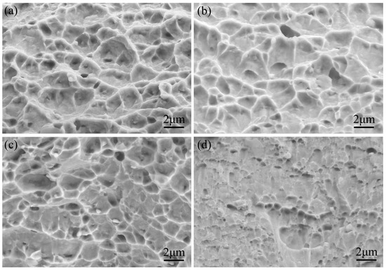 The fractography is laid out in Figure 8; the cold-formed STACER after the tensile test shows equiaxial dimples with craters of varying sizes and depths, since the number of dimples per unit area on the fracture surface depends on the number of nucleation sites and the plasticity of the material. If many nucleation sites were present, void growth would be limited because of the intersecting and linking up of neighboring dimples [26,27]. The SEM images indicated that the fracture mechanism is mainly ductile due to the weakness of the grain boundaries and the aggregation of micropores, which is indicative that the Co40NiCrMo strip has high strength and relatively good ductility [28,29]. The microscopic fractography of the Co40NiCrMo STACER obtained by the winding and stabilization process is shown in Figure 8b–d, which showed that, with the increase in heating temperature, the depth of the dimples became shallower, and the craters became smaller. In this condition, the number of dimples per unit area on the fracture surface depends on the number of nucleation sites, the number of grains, and the plasticity of the material. Many cracks formed at the grain boundaries and intergranular cracking occurred by the growth and coalescence of the micro voids along the grain boundary during the tensile test; the dominant mechanism of ductile fracture for the Co40NiCrMo is the coalescence of the high density of nucleated voids. The change in failure behavior could be dictated by the interaction between the dislocation movements [30]. As shown in Figure 7, after the process parameter of 520 °C + 4 h, the strength decreased and the toughness increased [31]; combined with the tensile experiment results and the service performance of the STACER, we set 520 °C + 4 h as the optimum parameters for stabilizing heat treatment.