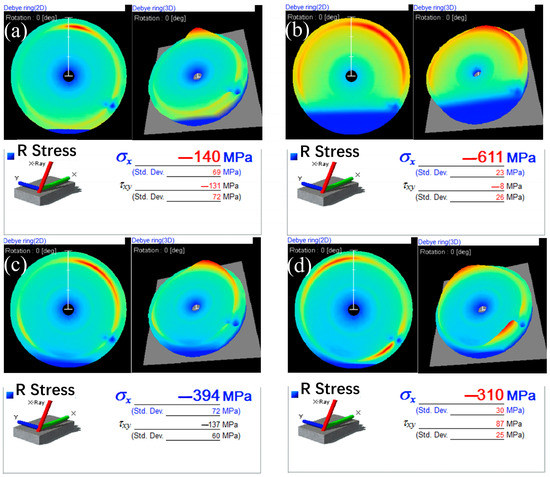 In this paper, two methods are used for the measurement of the residual stress of STACER: sin2 Ψ and cos α. (1) Proto iXRD apparatus was used to collect the diffraction peaks for the stress calculation via the sin2 Ψ method. The Proto apparatus is limited to seven different incident angles between ±13°; for each incident angle, 30 exposures of 0.25 s were used, so measuring time was 52.5 s. All the diffraction peaks were fitted by using the Gaussian peak fitting method to obtain the value of residual stress. (2) The measurement device used for the cosα method is Pulstec μ-X360n X-ray residual stress analyzer with Cr-tube (X-ray wavelength λ = 2.291 Å, operating voltage is 30KV, operating current is 2mA), which is a compact portable system with a 2D area detector based on the principle that the strains are first determined by the acquired Debye–Scherrer ring and then the residual stress is calculated by the cosine α method [19,20,21]. The Kα doublet from {220} plane’s family was used due to its high Bragg’s angle (2θ = 128.902°) providing better accuracy of measurement; the surface of the STACER was cleaned by ethanol without any other treatment.