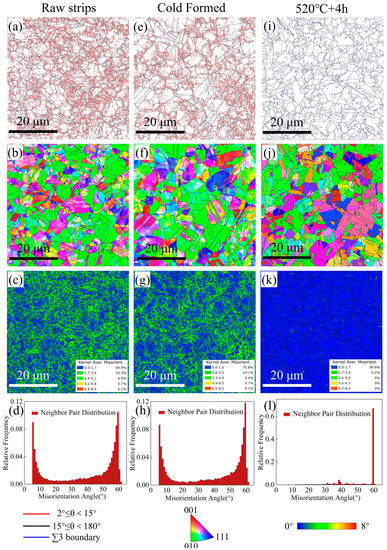 Results of EBSD studies: GB (a,e,i), IPF (b,f,j), KAM (c,g,k), and MAD (d,h,l) maps of raw strips (a–d), cold-formed STACER (e–h) and winding and stabilization STACER specimens (i–l).