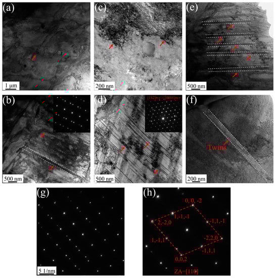 TEM images of Co40NiCrMo strips, Raw strips (a,b); cold-formed STACER (c,d); winding and stabilization STACER (520 °C + 4 h) (e–g) selected-area electron diffraction (SAED) pattern for twins in (f); (h) indices to (g).