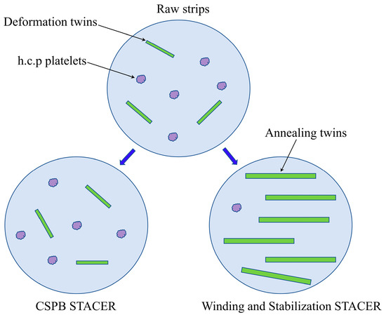 Schematic plot of strengthening mechanisms for raw strips, CSPB STACER, and winding and stabilization STACER.