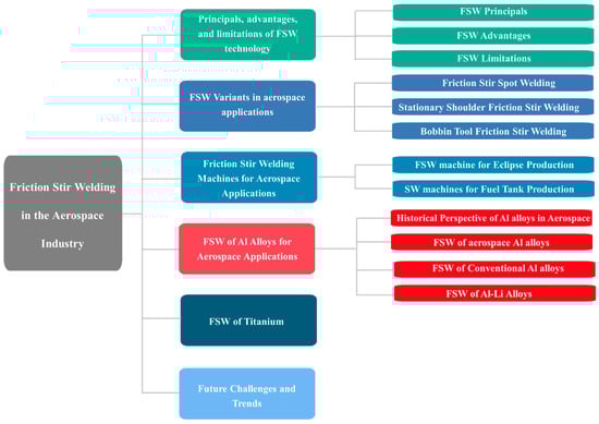 As described above, there has been significant progress on the FSW process, but only limited literature can be found regarding a more comprehensive review of FSW in the aerospace industry. With this background, we tried to provide a review of the historical development of FSW technology followed by the state of the art of FSW for aerospace applications. A literature survey was conducted in the Web of Science and Scopus databases and the Google Scholar internet search engine based on the terms: “FSW + aerospace” and “friction stir welding + aerospace”. Due to the novelty of the FSW subject (not longer than 30 years), the search was not limited by time. This resulted in a collection of over 300 articles. After removing duplicate, substantively distant articles and those of dubious quality (e.g., unpublished and unreviewed research reports), almost 200 papers were left for further analysis. Figure 1 shows a schematic flowchart of the strategy used to prepare the current review. This review reports the principals of FSW, its advantages, and limitations concerning aerospace applications in Section 2. The main FSW variants applied in the aerospace industry, such as friction stir spot welding, stationary shoulder friction stir welding, and bobbin tool friction stir welding, are outlined in Section 3. The FSW production machines in the aerospace industry are described in Section 4, mainly the Eclipse FSW machine and fuel tank FSW machines. The up-to-date research in the FSW of aerospace materials is summarized in Section 4 with a focus on aluminum alloys. Figure 2 shows the structure of this review.