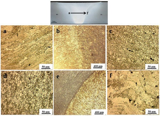 The optical microstructure across the different zones of the weld area in FSWed 20 mm-thick AA7075 is presented in Figure 6a–f. The microstructure sequence is shown according to the arrow indicated on the optical macrograph of the joint above the figure. Figure 6a,b clearly shows the diffusive interface and the rotated large grain structure in the TMAZ at the interface between the TMAZ and the NG at the RS. Figure 6c,d, inside the NG zone, indicates the recrystallized grain structure, and it can be observed that the grain size is slightly more prominent at the AS (d) than at the RS (c) due to the height of the AS. Figure 6e,f clearly shows the sharp transition and the rotated large grain structure at the TMAZ at the interface between the TMAZ and the NG at the AS. These macro- and microstructural features of the FSWed materials have a strong implication for the enhancement of properties and the integrity of joints.