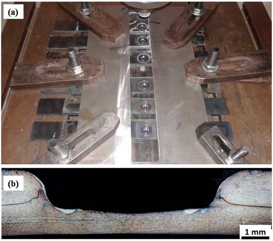 (a) Top view of FSSWed TWIP steel sheets showing the exit holes and (b) macrograph of the transverse cross-section showing the reduction in the sheet thickness.