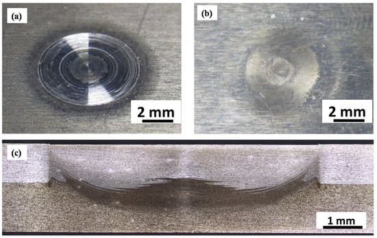 RFSSW joint between AA2024-T3 and AA7075-T6 sheets for aerospace applications. (a) Top view, (b) bottom view and (c) transverse cross-section macrograph [47] (has permission from Elsevier).