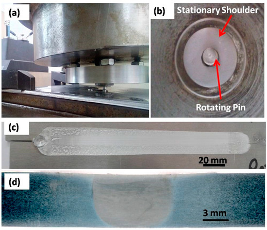 (a) External view of SSFSW setup upon plunging. (b) Underneath view showing the stationary shoulder and the rotating pin. (c) Top view of the SSFSWed AA7075. (d) Transverse cross-section macrograph of SSFSWed AA7075 [112].