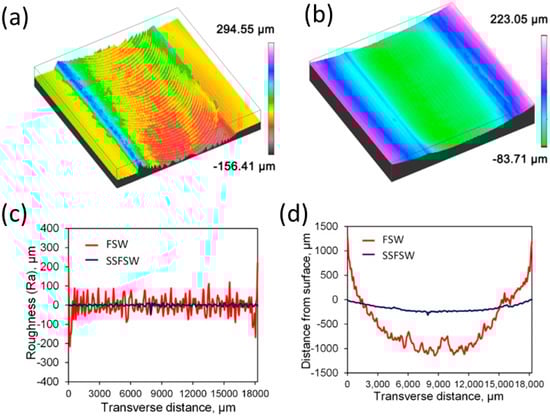 The surface quality characteristics and the surface roughness, respectively, obtained using (a,c) conventional FSW tool and (b,d) SSFSW tool [118] (has permission from Elsevier).