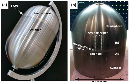 Images of (a) prototype of the propellant tank, (b) friction stir welded hemicylinder showing overlap region [42] (has permission from Elsevier).