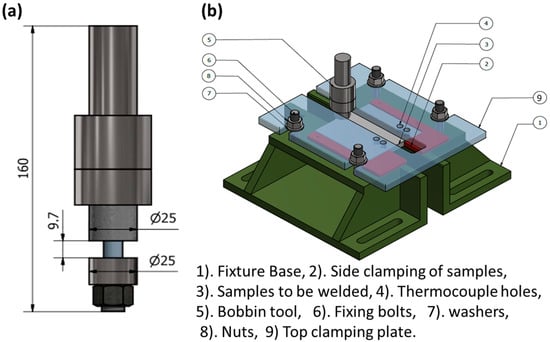 Figure 16 shows a schematic for the bobbin tool FSW (BTFSW) tool with the two shoulders (upper and lower) in (a), as well as an example of the fixture setup used for BTFSW presented in (b). It can be mentioned that BTFSW does not need a backing plate, which makes it ideal for welding hollow sections and reduces the applied vertical force that can result in reduced torsion.