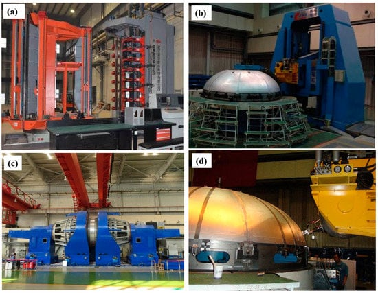 Based on that, the FSW machines used in the manufacturing of fuel tanks are classified into three categories: (1) equipment for tank barrel welding, which is a vertical-frame-type longitudinal FSW machine (Figure 19a); (2) equipment for ellipsoid dome welding, which is a large enclosed-frame-type FSW (Figure 19b); (3) circumferential FSW equipment with the integration of outside positioning and main driving (Figure 19c).
