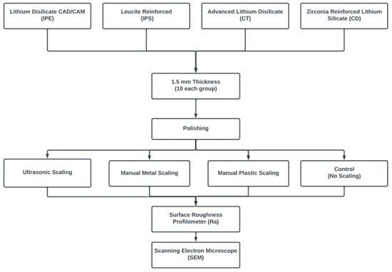The longevity of dental restorations is one of the most important criteria in evaluating the success of the definitive restorations. Achieving this criterion depends mainly on the patient’s oral hygiene together with the mechanical properties of the materials used in fabricating the definitive prosthetic restorations [21]. Routine scaling and root planing are critical in preserving the normal periodontal health through the removal of the biofilm and calculus deposits, in addition to pocket debridement [22]. These methods can be manually performed using hand metallic curettes or piezoelectric ultrasonic scalers and different types of scaling tips such as plastic, stainless steel, or titanium tips [23,24]. All of these scalers might compromise the surface roughness of the dental ceramic restorations and lead to unfavorable consequences [25,26]. Additionally, the material of the scaling tips has specific indications; for example, plastic tips are used particularly for implant-supported restorations to avoid any harmful consequences on the longevity and osseointegration of dental implants [27].