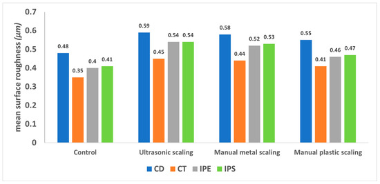 Surface roughness (Ra) of manual plastic scaling of each: (a) CD, (b) CT, (c) IPE, and (d) IPS. CD; zirconia-reinforced lithium silicate (Celtra Duo). CT; advanced lithium disilicate (CEREC Tessera). IPE; lithium disilicate (IPS Emax CAD). IPS; leucite-reinforced (IPS Empress CAD).