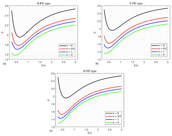 Figure 3 illustrates the influence of the power law index n and width-to-length ratio on the dimensionless critical buckling load F of various types of simply supported FGGPL-reinforced composite doubly curved shallow shells. All obtained results behave in a manner similar to the variation of the aspect ratio and the power law index. They decrease until they reach their minimum and then increase as the aspect ratio increases, whereas they decrease directly as the power law index increases.