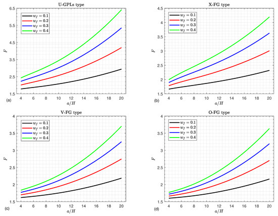 Figure 4 depicts the critical buckling load F curves of FGGPL composite doubly curved shallow shells against the side-to-thickness ratio considering various graphene weight fractions as well as different graphene distribution types. The graphene components enhance the composite structure stiffness. Consequently, the greater the graphene weight fraction, the greater the buckling load. It is noted that there is a gradual buckling load increase with the increase in the side-to-thickness ratio.