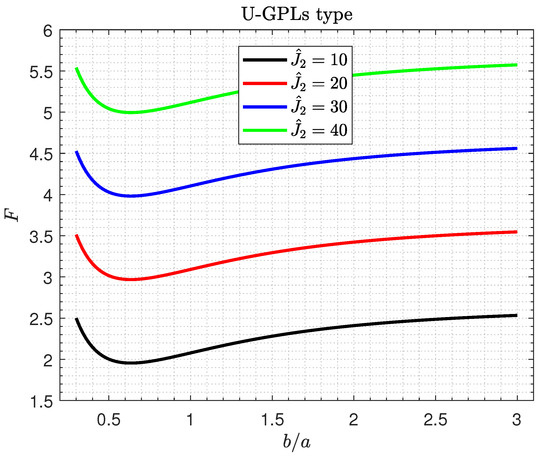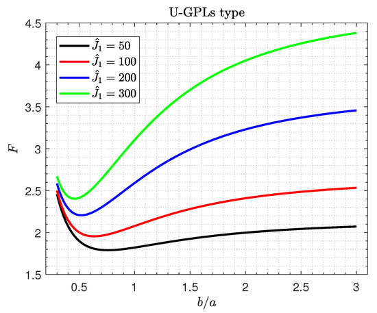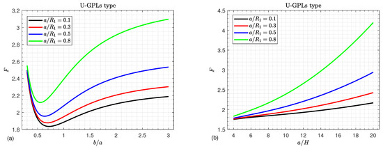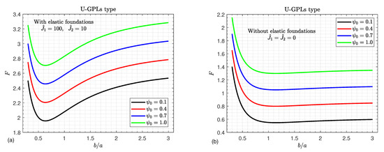 The effects of the shallowness ratio on the critical buckling load F of U-GPLs/piezoelectric nanocomposite doubly curved shallow shells versus the width-to-length ratio and the side-to-thickness ratio are plotted in Figure 5a,b, respectively. The buckling load F increases in a monotonic way with an increase in both the shallowness ratio and the side-to-thickness ratio , as shown in Figure 5b. Furthermore, the influences of on F are more pronounced for large values of . Furthermore, Figure 5a illustrates that increasing leads to an increase in the buckling load F. However, the buckling load F no longer decreases with the increase in the width-to-length ratio . For small values of the shallowness ratio , the buckling load F may be independent of the the shallowness ratio . This conclusion is easy to explain because an increase in the ratio causes the shells to become shallower.