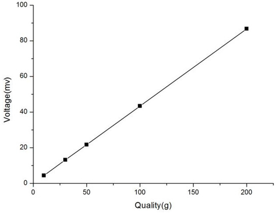 The device adopts fixed pulley transmission mode to produce the plane friction between the concrete roadbed surface and the sliding block. The sliding block and the high-precision strain sensor are connected by the highly elastic traction line so as to eliminate the influence of the deformation of the traction line on the test data as much as possible. The voltage value is obtained by hanging standard weights of different masses at the lower end of the strain sensor, and the corresponding relationship is found in order to accomplish the calibration of the strain collector. As shown in Figure 2, the voltage values corresponding to five different standard weights show a very good linear relationship, and the force resolution is , which is accurate enough to meet the function of experimental measurement of material friction behavior. In the test, the positive pressure generated by the relative sliding process between the slider and the concrete block is controlled by changing the mass of the counterweight block, and the sliding speed of the material friction is controlled by changing the tensile rate of the material testing machine.
