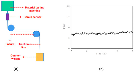 Schematic diagram of the process of producing the friction between the sliding block and the concrete surface through the friction between the traction wire and the fixed pulley. Among them, (a) is the calibration process of the test device, and (b) is the change curve of friction with time.