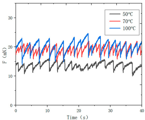 Figure 5 shows the variation curve of concrete material friction with time under three temperatures. The results show that the value of friction increases gradually with the increase of temperature. The average friction is 13.61 mn when the concrete surface temperature is 50 °C, 19.14 mN when the temperature is 70 °C, and 20.05 mN when the temperature is 100 °C. In addition, it is obvious from the figure that the vibration amplitude of the friction increases gradually with time. The difference between the maximum and minimum frictions is 1.12 mN at 50 °C, 1.75 mN at 70 °C, and 2.29 mN at 100 °C. As the temperature of concrete material increases, the bonding property of concrete material improves. Therefore, the friction of the concrete material increases with the increase in temperature, and it has significant stick-slip characteristics.