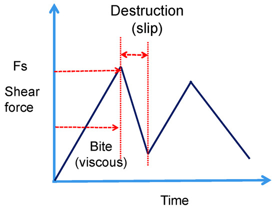 The material interface presents different forms at macro and micro levels. For example, the smooth and continuous material surface on the macroscopic level is composed of a large number of non-uniform and discrete concave convex bodies on the microscopic level, as shown in Figure 3. When the sliding block and the concrete surface are subjected to positive pressure, the micro-concave–convex will occlude (viscous), and when it is under traction action, the occluded (viscous) concave–convex may rupture. Additionally, this process depends on whether the local shear force has reached the maximum shear strength of the concave–convex. With the continuous movement of the slider, the broken (sliding) concave convex bodies are recombined and occluded (viscous) together, then the occlusion-destruction-occlusion-failure of a single microscopic concave–convex body shows an obvious stick-slip phenomenon, as shown in Figure 6. The cyclic behavior of the “occlusion-destruction-occlusion-destruction” of the microcosmic concave–convex body results in the propagation of shear force at the contact interface, which is also manifested as stick-slip phenomenon at macro scale after the evolution of complex microscopic behavior. Therefore, the sliding blocks are separated into numerous equal rigid sliding blocks, and each sliding block is connected by springs. The mass m of a single sliding block is the ratio of the mass of the sliding block to the number of sliding blocks. The equivalent stiffness of the sliding block is , which is related to the elastic modulus of concrete and the segmented shape. Additionally, the adjacent slide blocks are connected by springs.