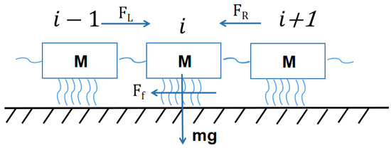 where is the mass matrix, is the damping matrix, is the slider stiffness matrix, and is the external force of the system. The forces from the left and right sliders are perpendicular to the contact direction and the gravity of slider acts on the strength of interface spring , thereby affecting the stiffness of interface connecting spring . The number of divided sliders mainly affects the slider stiffness and shear strength. Here, we present a design schematic diagram to simulate the action of the micro-concave–convex body on the concrete interface, as shown in Figure 7.