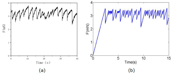 Segmented sliding blocks mainly affect the slider stiffness and friction strength, and also change the number of sliding block models and the slider stiffness and friction strength at the same time. This has no effect on the final friction value. The more sliders there are, the longer the stick-slip time will be in the friction process; this is closer to the real experimental observation value, but the corresponding time is extremely long. In this paper, 50 sliding blocks are selected for calculation and the central difference method is used to solve the dynamic equation. The simulation results and experimental results are shown in Figure 8. The friction values of the experimental and simulated results are 3.21 Mn and 3.12 Mn, respectively, and the change curve of concrete surface friction with time shows an obvious stick-slip phenomenon. The numerical simulation results are consistent with the experimental test results.
