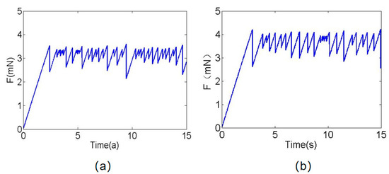 The result shows that the shear modulus of concrete is mainly affected by temperature change. Its modulus decreases gradually with the increase in temperature, but its cohesiveness increases gradually with the increase in temperature. Therefore, in the spring slider model, changes in the friction characteristics of concrete surfaces under different temperatures are accomplished by adjusting the modulus of material and the initial traction force; in this way, the friction characteristics of concrete surfaces under temperature changes can be studied qualitatively. Figure 9a is the calculation result of the friction characteristics of concrete pavement at a temperature of 50 °C, and Figure 9b is the calculation result of the friction characteristics of concrete pavement at a temperature of 100 °C. It is found that the value of friction increases gradually with the increase in temperature, and it has a significant stick-slip characteristic, which is consistent with the experimental results.