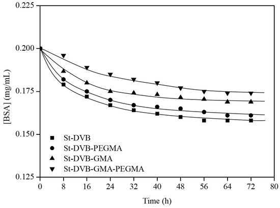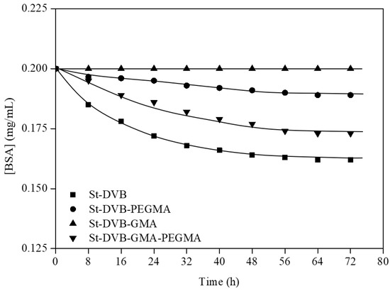 The quantity of BSA immobilized onto the particles was determined through UV spectroscopy, by calculating the difference between the initial and final BSA concentration in PBS solution. The kinetics of albumin immobilization onto non-wetted St-DVB based particles was carried out (Figure 3). The BSA immobilized in each case was 1.8 mg BSA/g particles for non-functionalized particles, 1.3 mg BSA/g particles for functionalized particles with GMA and PEGMA, and 0.53 mg BSA/g particles for PEGMA functionalized particles. In the case of GMA functionalization, no BSA was immobilized onto the particles.