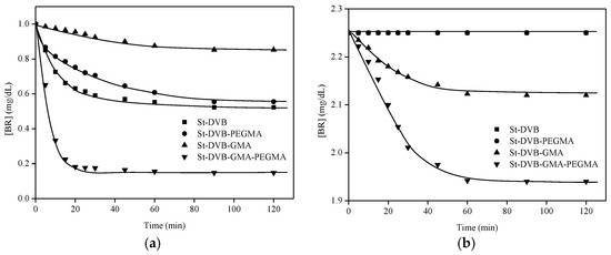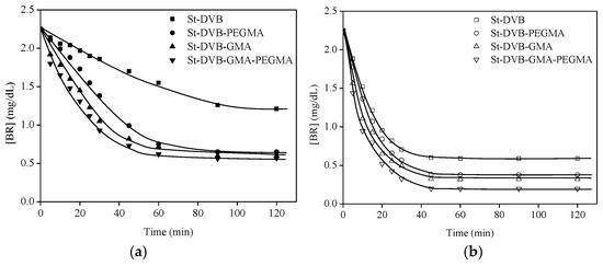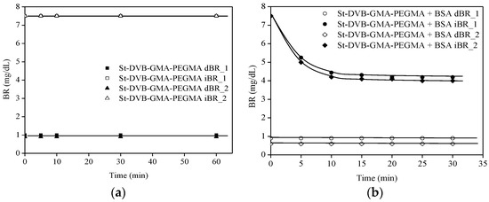 According to the results in Figure 7a, particles that did not contain BSA were not effective in removing bilirubin from plasma. On the contrary, Figure 7b shows the results of two experiments with the same initial bilirubin concentration, with the particles removing an average of 8.5 mg of bilirubin per gram of particles in less than 30 min. The amount of indirect bilirubin removed in each experiment was 8.3 and 8.75 mg BR/g of particles, respectively. Thus, the presence of albumin provided selectivity, preventing the particles from St-MMA-GMA-PEGMA becoming saturated with other blood components or metabolites.
