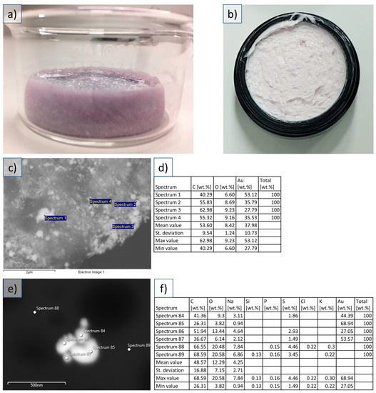 Dried AuNPs, cosmetic cream with AuNPs, and SEM examinations. (a) Freeze-dried PVP cake with AuNPs. (b) Cosmetic cream with embedded AuNPs. (c) SEM image of the dried AuNPs. (d) EDX analysis of select points in the corresponding SEM image of the dried AuNPs. (e) SEM image of the AuNPs embedded in the cosmetic cream. (f) EDX analysis of select points in the corresponding SEM image of the AuNPs embedded in the cosmetic cream.