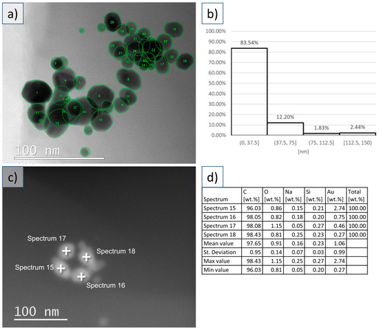 TEM investigations of the dried AuNPs and the cosmetic cream with AuNPs. (a) TEM image of the dried AuNPs with particle size and morphology analysis. (b) Size distribution of the analyzed AuNPs. (c) TEM image of the AuNPs embedded in the cosmetic cream. (d) EDX analysis of select points in the corresponding TEM image of the AuNPs embedded in the cosmetic cream.