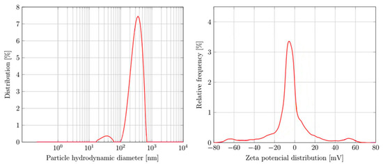 The DLS measurements were conducted on AuNPs suspensions with a prepared concentration of 0.00172 g/mL (grams of dried AuNPs per ml of distilled water). The obtained hydrodynamic diameter and size distribution are shown in Figure 3 and Table 2 and Table 3. The measured sample had a distinct peak in the size range of 100–700 nm and an additional peak in the size range of 20–60 nm. The measured hydrodynamic diameter was 303.7 nm, with the polydispersion index at 27.98%. The zeta potential distribution is shown in Figure 3, with a measured average zeta potential of −4.51 mV (Table 4).