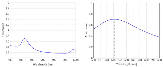 The UV–vis measurements are shown in Figure 4, with a visible UV absorption peak for the AuNPs at 532 nm.