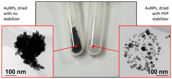 Comparison of the dried AuNPs’ dispersion and agglomeration from TEM images, with and without a stabilizer.