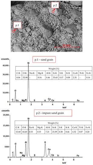 Figure 2 and Figure 3 present the semi-quantitative SEM-EDS results for the F30 mortar at the areas of the cracks. Figure 2 shows the image of lime mortar with sand grains. Point p.1 identifies a slightly impure grain of sand. Point p.2 identifies a significantly impure grain of sand. The content of identified elements is by weight (%).