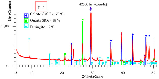 Figure 4 shows the X-ray phase analysis diffraction test of mortar F30 in the crack area at point p.0 (Figure 1). Based on the analysis the presence of calcite CaCO3 quartz SiO2 and ettringite was found.