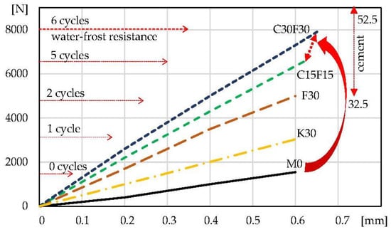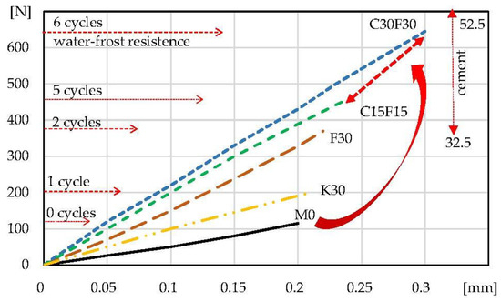 Figure 7 and Figure 8 show the composites under load during the fc and ftb tests. The load–displacement of crosshead correlation enables the determination of the tgα, which indicates the effect of the additives used on the change in the deformation ability of the tested composites. In addition, information on the assumed effect of changing the class of cement on the properties of composites with C15F15 and C30F30 hybrid additives is in the upper right corner. The information about the corresponding water resistance test is on the left side.