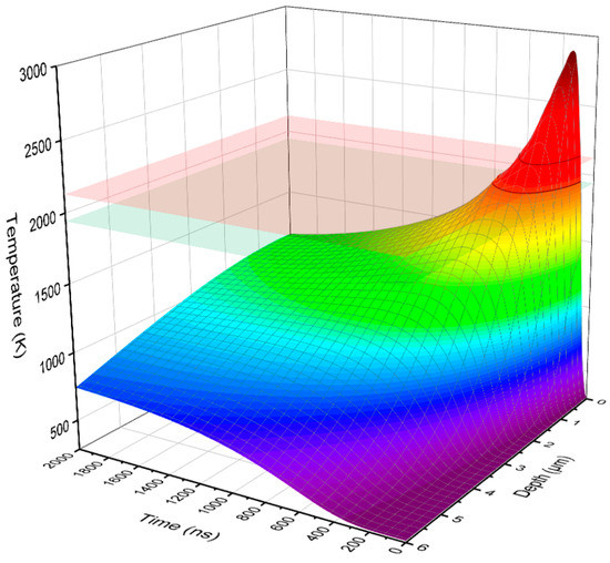 The spatiotemporal evolutions of temperature induced by IPIB irradiation on a Ti substrate with a 400 nm Cr film is shown in Figure 2. The simulation results indicated that the surface temperature of the sample rapidly increased to 2886 K within ~150 ns upon the impact of IPIB at 2 J/cm2, then decreased due to the heat transfer to the deeper regions.