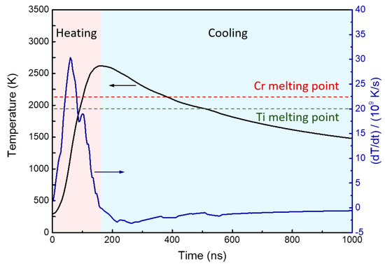 Further analysis of the variations in temperature and its change rate with time at a depth of 400 nm (i.e., the interface between film and substrate) was performed, and the results are presented in Figure 3. The findings revealed that the highest heating rate and cooling rate at this depth could reach the order of 1010 K/s and 109 K/s, respectively, which creates a non-equilibrium condition for the emergence of a metastable structure in the surface layer. Besides, the maximum temperature at the interface exceeded the melting point of Ti and Cr, indicating the occurrence of a melting coexistence period of the film and substrate. Figure 4 shows that the melting coexistence period of Ti and Cr lasted for 280 ns for 1 IPIB pulse. Moreover, the melting and solidification of Cr on the surface occurred prior to those of Ti on the subsurface. The existence of melt on the (sub)surface began at 86 ns and lasted until 520 ns. The maximum melting depth was estimated to be 1.18 μm. The presence of melt in the surface layer can facilitate effective homogenization of the composition inside the melt, and the mass exchange between the film and substrate can be more readily achieved, especially during the melting coexistence period.