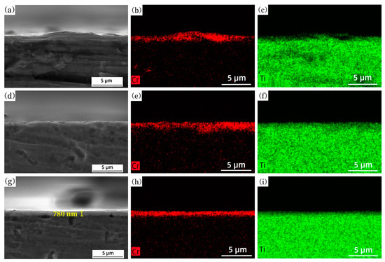 The cross-section of the Ti-Cr alloy coating formed by different IPIB pulses and the corresponding element distribution of Cr and Ti are shown is Figure 6. The alloy layer displayed uneven element distribution after 1 pulse treatment, with numerous Cr-rich areas and Ti-rich areas present (Figure 6a–c). The surface showed a large fluctuation and significant roughness (Figure 6a), which might be attributed to the ununiform composition distribution in the surface layer, intensifying the instability of fluid flow under the thermal shock of IPIB. However, subsequent IPIB irradiation promoted the redistribution of elements, resulting in a more uniform composition distribution and smoother surface of the alloy coating after 20 pulses (Figure 6g–i). The thickness of the alloy coating was ~780 nm. All the above results demonstrated that increasing the number of IPIB pulses was conducive to improving the uniformity of the mixing of film and substrate.