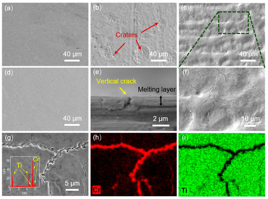 The formation of surface cracking observed in the present study is probably attributable to the thermal expansion coefficient mismatch between Ti and Cr [55]. Under IPIB irradiation, the melted region of the surface layer rapidly cooled and solidified, creating tensile stress at the interface duo due to the different thermal expansion properties of the film and substrate. This stress caused cracks to generate at the interface and extend to the surface [56,57]. As shown in Figure 7b, plenty of large-size cracks were observed on the surface after 1 pulse irradiation. The cross-section morphology in Figure 7e clearly illustrates the vertical crack. Figure 7g–i exhibits the element distribution around the crack. Surface cracking exposed the substrate. This might provide the paths for Ti movement to the surface, thereby accelerating the progression of surface mixing. As irradiation continued, a uniform Ti-Cr mixing layer was formed on the surface. The composition gradient mixing layer replaced the two-layer system, significantly reducing the tensile stress caused by the local differences in the physical properties. This means that the cracking behavior was suppressed with further irradiation. Moreover, the surface melting induced by IPIB irradiation may have “cured” the pre-existing surface cracks. As depicted in Figure 7c, the large-size cracks disappeared after 5 pulses of irradiation, suggesting that they had been “cured”. However, some small cracks were still observed in the local enlarged view (Figure 7f), indicating the existence of localized uneven mixing areas on the surface after 5 pulses. Notably, there were almost no cracks on the surface after 20 pulses of irradiation (Figure 7d) due to the homogenization of the composition in the surface layer.