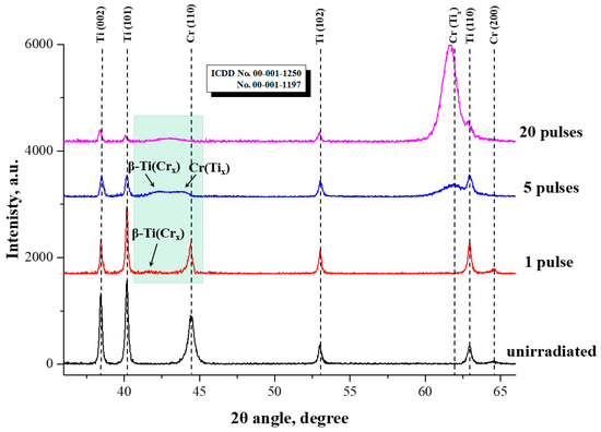 The XRD patterns of the Cr/Ti system samples, before and after IPIB treatment, are presented in Figure 8. The unirradiated sample exhibited diffraction peaks of α-Ti with a hexagonal close-packed (hcp) structure and Cr with a body-centered cubic (bcc) structure, corresponding to the substrate and film, respectively. After 1 pulse of IPIB irradiation, a new diffraction peak appeared at a diffraction angle of ~41.5°, which is probably attributed to the formation of a β-Ti (Cr) supersaturated substitution solid solution. Similar findings have also been reported in the literature [19].