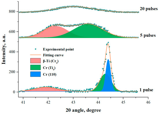 In the Ti-Cr binary phase diagram, the eutectoid reaction occurs when the Cr content reaches ~12.5 at.%. However, IPIB irradiation enabled the attainment of much higher solid solubility than this value because it induced an ultra-high undercooling on the surface. The dissolution of Cr into the Ti lattice provided a stability effect for the metastable phase [58,59], which promoted the transformation of α-Ti into β-Ti. Moreover, the addition of Cr reduced the lattice parameters of β-Ti, due to the smaller atomic radius of Cr compared to Ti. Consequently, the diffraction peak of solid solution β-Ti (Cr) shifted towards the large angle side. Additionally, after 1 pulse of IPIB irradiation, the diffraction peak of Cr (110) became weak due to the partial mixing of Cr into the Ti lattice, whereas the dissolution of Ti into the Cr lattice also occurred. As a result, the diffraction peak of the solid solution Cr (Ti) was separated from the Cr (110) diffraction peak, resulting in the asymmetric shape of the Cr (110) diffraction peak. This phenomenon was observed more clearly from the local enlarged view in Figure 9.