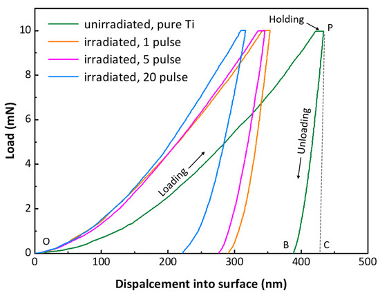 Load-displacement curves of the pure Ti sample and the Ti-Cr alloy coating samples with different pulses of irradiation.