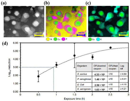 Elemental mapping of chemical species in the microstructure of copper–glass ceramic by energy-dispersive X-ray spectroscopy (EDS) using a scanning transmission electron microscope: (a) A microstructural view of the copper–glass ceramic highlighting the three phases present. Some smaller cuprite crystals were also observed in the continuous phase. (b) EDS elemental mapping. (c) EDS elemental mapping also revealed that the lower-durability phase was enriched in potassium. (d) Bacterial reduction kinetics on paint coupons containing copper–glass ceramic particles. Graph shows S. aureus reduction as a function of exposure time [54].