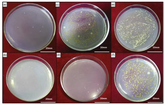 Photos of bacterial colonies on different stainless steels after immersion in the tap water for different durations: (a) 304 for 24 h, (b) 304-Cu for 24 h; (c) 304 for 48 h, (d) 304-Cu for 48 h; (e) 304 for 72 h, (f) 304-Cu for 72 h [68].